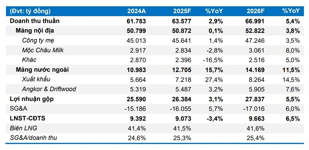 Mảng kinh doanh trong nước nối tiếp đà phục hồi. Quý 3/2025 doanh thu đạt 13.494 tỷ đồng (+4,4% so với cùng kỳ năm trước và -0,9% so với cùng kỳ quý trước), sự phục hồi vẫn tới từ doanh thu nội địa công ty mẹ với 12.227 tỷ đồng (+5,3% so với cùng kỳ năm trước) trong khi Mộc Châu Milk doanh thu tiếp tục suy giảm 3,2% so với cùng kỳ năm trước đạt 716 tỷ đồng.