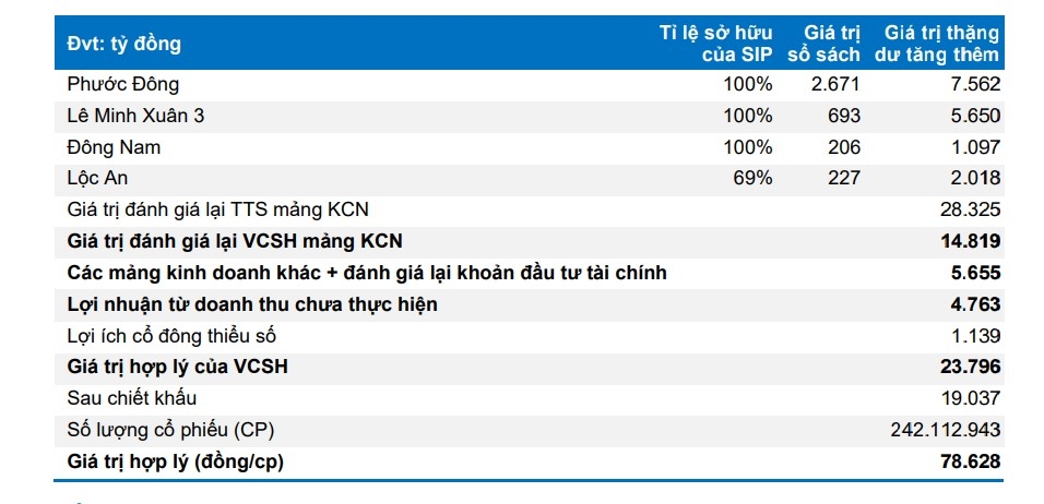 Giá trị hợp đồng các quỹ đất còn lại là rất lớn, ước tính 39.707 tỷ đồng. Cùng với KCN Phước Đông, SIP còn đang phát triển KCN Lê Minh Xuân 3 (còn 125,1 ha thương phẩm); Đông Nam (24,3 ha) và KCN Lộc An - Bình Sơn (còn 133 ha). Các khu công nghiệp đều có vị trí tại các tỉnh tập trung lượng lớn vốn FDI tại miền Nam, tạo cho SIP cơ hội đón dòng vốn và tăng trưởng trong dài hạn. Công ty Chứng khoán Bảo Việt (BVSC) ước tính tổng giá trị hợp đồng tới từ các KCN đang hoạt động của SIP là 39.707 tỷ đồng. Trong 2025, chúng tôi dự phóng SIP sẽ bàn giao 39,9 ha đất KCN đem lại giá trị hợp đồng 1.754 tỷ đồng và đóng góp vào doanh thu 46 tỷ đồng.