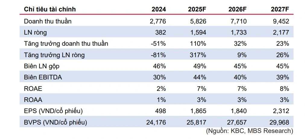 MBS dự phóng lợi nhuận (LN) ròng Quý 3/2025 tăng 95% so với cùng kỳ trên mức nền thấp cùng kỳ năm trước. Nhiều dự án KCN và KĐT mới được phê duyệt đầu tư KBC liên tiếp nhận được quyết định chấp thuận chủ trương đầu tư dự án KCN và KĐT mới gồm KCN Tràng Duệ 3, KCN Kim Thành 2 GĐ1, KCN Quế Võ 2 mở rộng, KCN Phú Bình, KCN Sông Hậu 2, KCN Bình Giang, KĐT Tràng Cát, khu phức hợp Trump International. Quỹ đất lớn tạo động lực tăng trưởng cho KBC trong dài hạn.