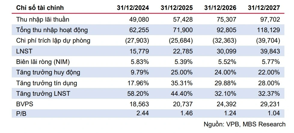 MBS duy trì khuyến nghị khả quan đối với cổ phiếu VPB với giá mục tiêu 42.400 đồng/cổ phiếu MBS điều chỉnh LNTT 2025F/2026F so với báo cáo gần nhất lần lượt 13,6%/11,7% do kỳ vọng LN các công ty con đóng góp đáng kể hơn.