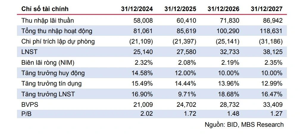 Theo Công ty Chứng khoán MB (MBS), lợi nhuận ròng của NH TMCP Đầu tư và Phát triển Việt Nam (BID - sàn HSX) dự kiến tăng trưởng 9,7%/18,7% so với cùng kỳ do đẩy mạnh tăng trưởng tín dụng và thu hồi nợ xấu đã xử lý rủi ro. Tỷ lệ nợ xấu dự kiến tăng so với cùng kỳ do có thể vẫn chịu ảnh hưởng từ áp lực thuế quan.