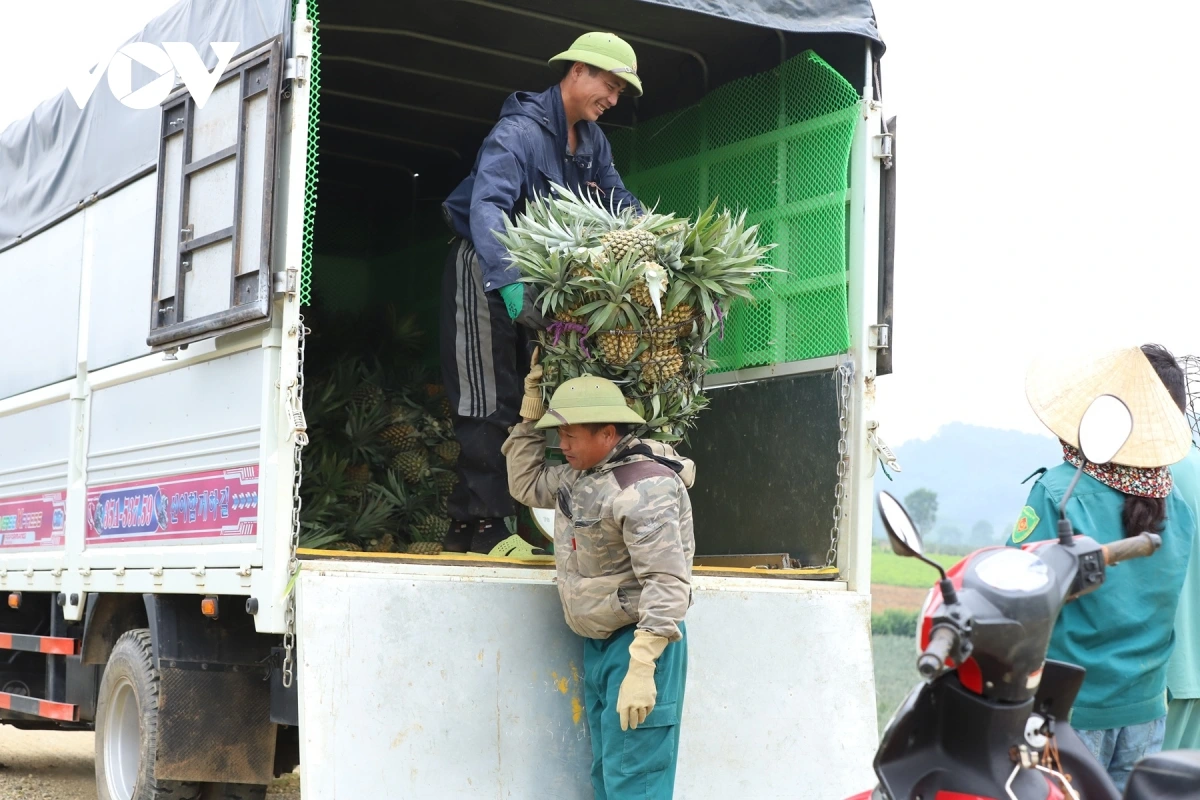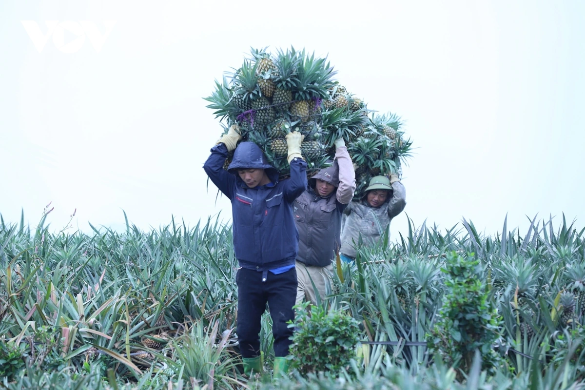 Giữa mùa thu hoạch, những công nhân cùng nhau nâng từng lồ dứa lên vai người gùi, tạo nên nhịp lao động khẩn trương. Vào chính vụ, công hái dứa tăng cao, nhưng đây cũng là công việc vất vả, đòi hỏi sức bền, khi giữa những luống nhỏ hẹp trên đồi, mỗi lồ dứa nặng tới 50 - 60 kg phải được vận chuyển thủ công ra điểm tập kết.