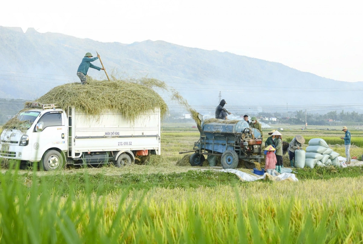 Từ mờ sáng, trên khắp các thửa ruộng, tiếng máy gặt, máy tuốt lúa hòa cùng tiếng nói cười hối hả, rộn ràng.