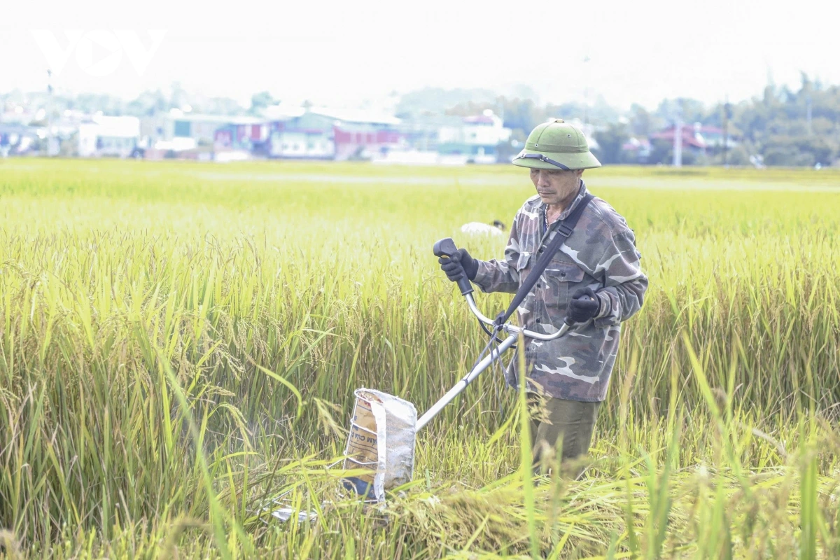 Tại các khu vực ruộng nhỏ hẹp, người dân vẫn duy trì gặt tay hoặc dùng máy cắt cỏ để thu hoạch.