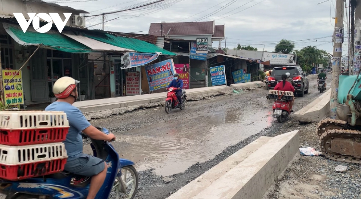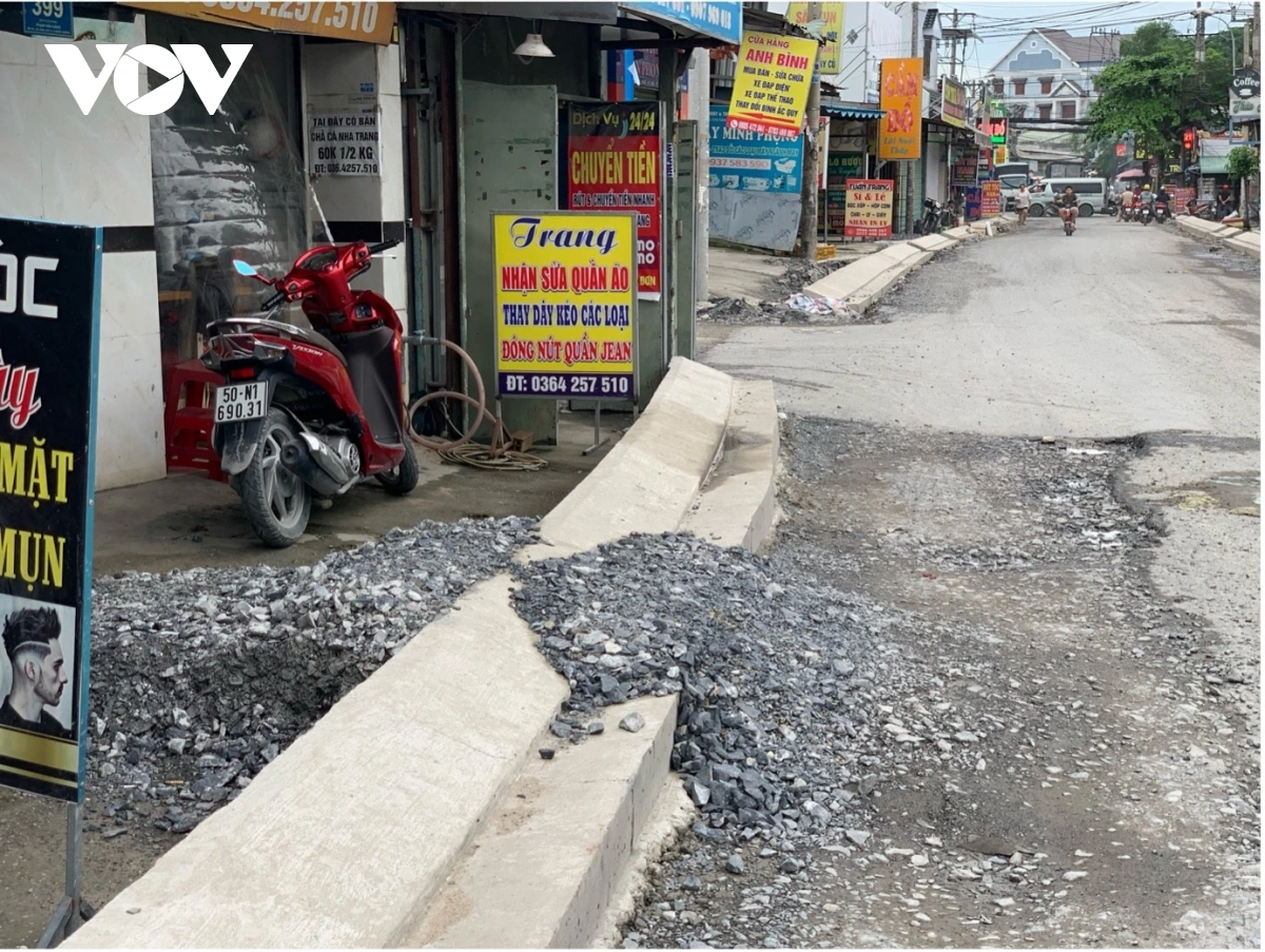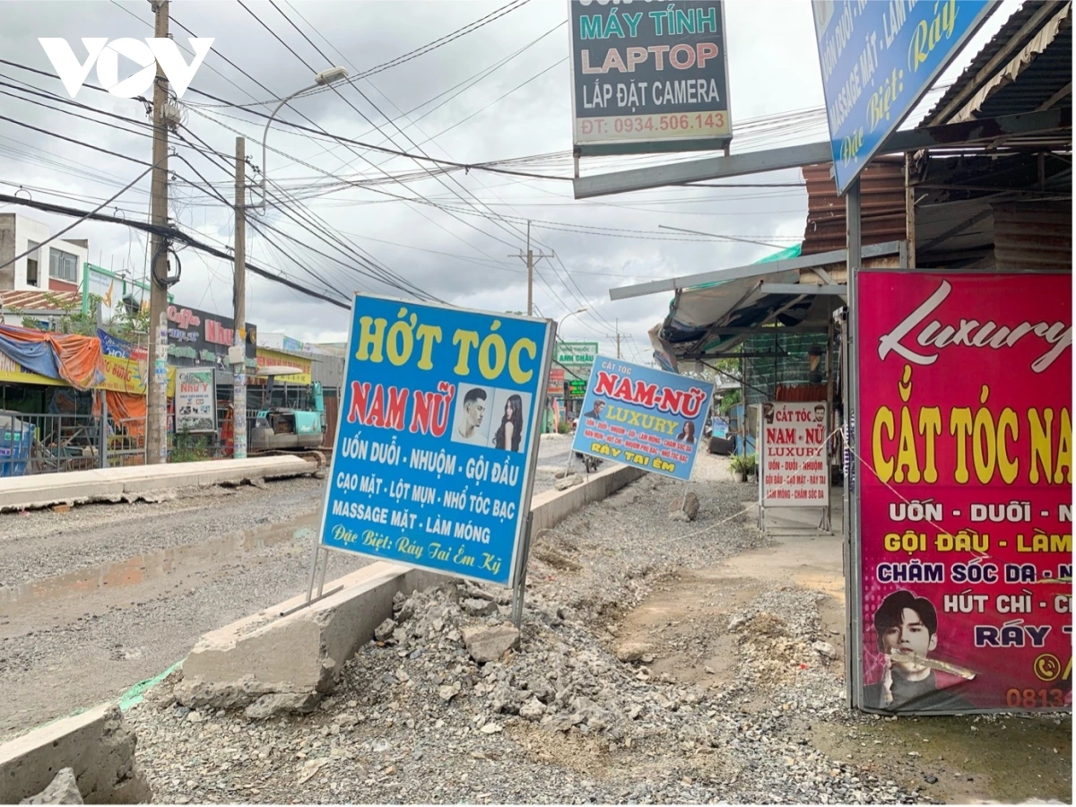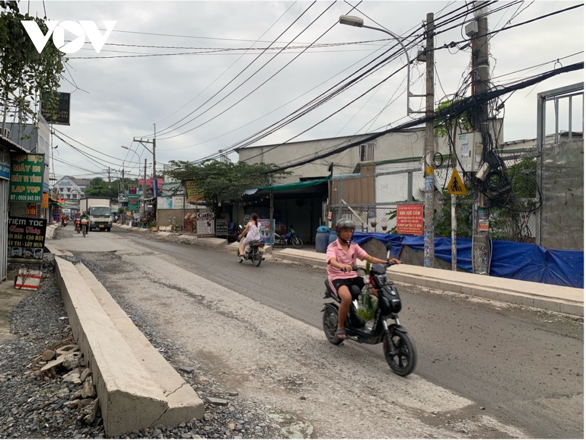 Ghi nhận chiều 11/6 cho thấy, đoạn đường từ giáp ranh huyện Hóc Môn tới giao lộ đường Quách Điêu đang trong giai đoạn thi công nâng cấp. Tuy nhiên, phần gờ bê tông định hình mặt bằng đã hoàn tất từ khoảng một tháng trước, với độ cao gây bất tiện rõ rệt cho sinh hoạt và kinh doanh của người dân.