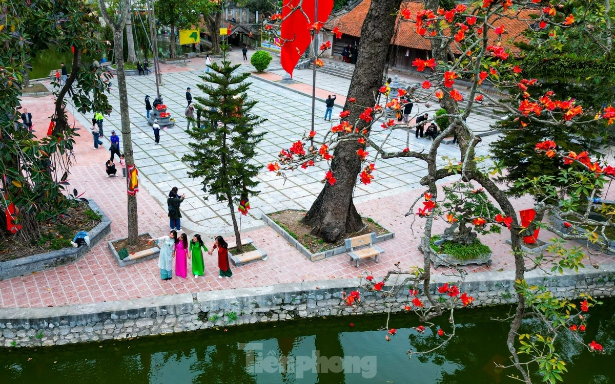 Nhiều du khách đến tham quan chùa Thầy say mê trước sắc đỏ rực rỡ của hoa gạo, tranh thủ check-in để lưu giữ những khoảnh khắc đẹp.