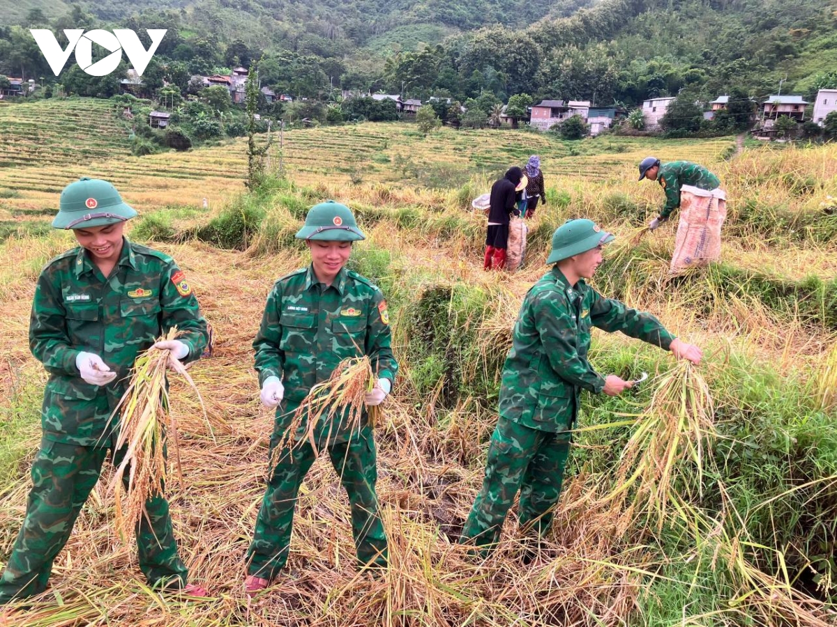 Trên cánh đồng, tiếng nói cười vang rộn xen lẫn tiếng liềm cắt lúa xào xạc. Những bàn tay rám nắng của người lính, của đoàn viên trẻ thoăn thoắt cắt, bó, khuân, phơi. Chẳng ai bảo ai, việc cứ thế trôi chảy trong không khí rộn ràng, ấm áp.