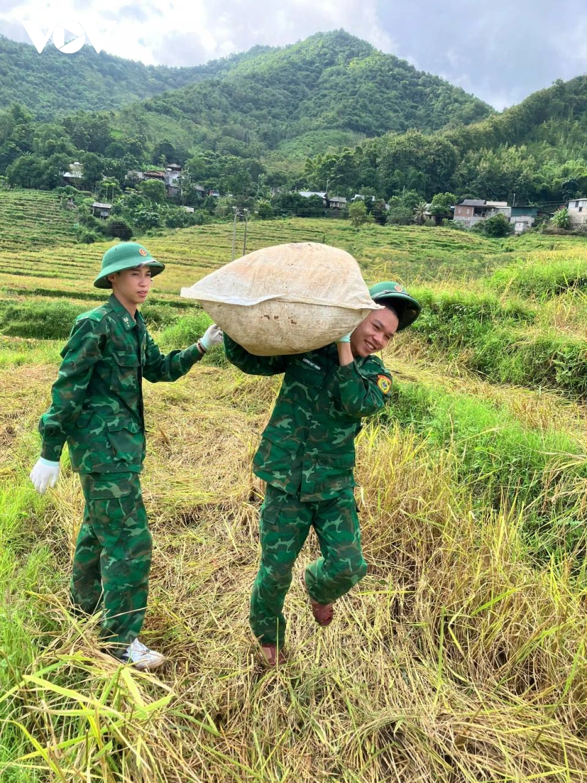 Mồ hôi dẫm áo, bao lúa trĩu nặng vai nhưng nụ cười của chiến sĩ áo xanh vẫn rạng rỡ.