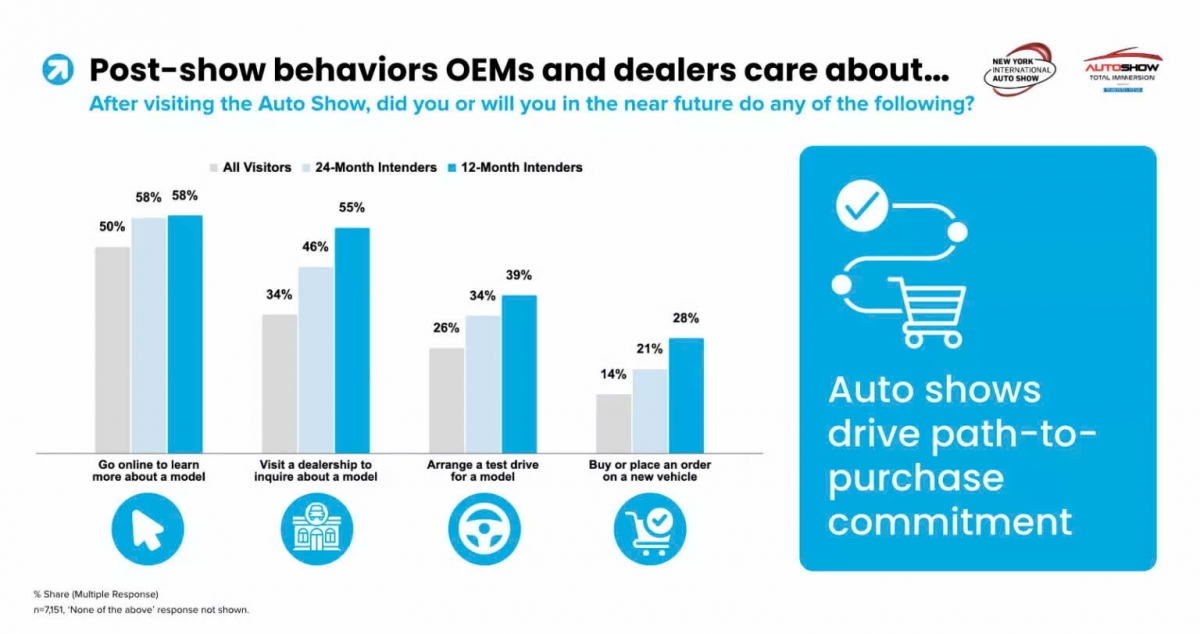 Nghiên cứu cũng chỉ ra rằng, mặc dù chỉ có 37% người tham dự đến triển lãm với mục đích tìm hiểu thông tin mua xe, nhưng 84% cho biết việc tham dự triển lãm đã giúp họ đưa ra quyết định mua xe. Đối với khách tham dự triển lãm và dự định mua xe trong vòng 12 tháng, 58% đã lên mạng sau khi tham dự để tìm hiểu thêm về một chiếc xe cụ thể. 55% đã đến đại lý, trong khi 39% đã sắp xếp một buổi lái thử. 28% cuối cùng đã mua được một chiếc xe mới.