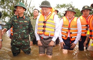 Hình ảnh Tổng Bí thư Tô Lâm thăm hỏi người dân giữa vùng ngập lụt ở Huế