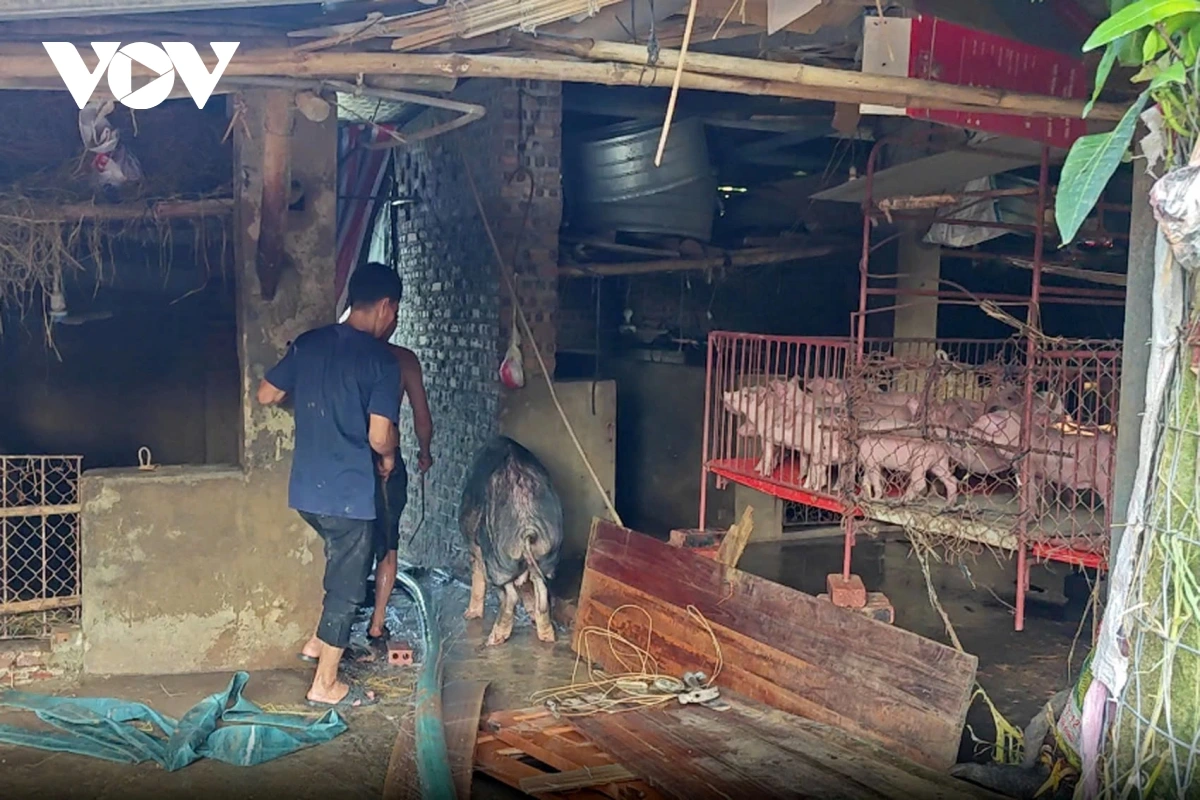 Ông Dương Văn Học, 61 tuổi ở xóm Soi 4, xã Phú Bình cho biết, mấy ngày trước đó, do nước sông lên nhanh tràn vào ngập hết nhà cửa, chuồng trại khiến đàn lợn gần 100 con phải chạy lũ khắp nơi.