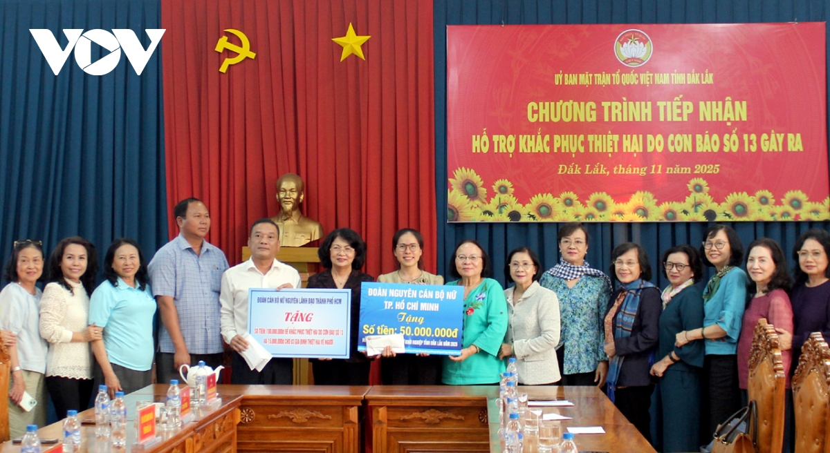 VOV.VN - Hôm nay (14/11), Đoàn nguyên cán bộ lãnh đạo TP.HCM do bà Đặng Thị Ngọc Thịnh, nguyên Phó Chủ tịch nước làm Trưởng đoàn, đã đi thăm một số địa phương ở tỉnh Đắk Lắk, trao tặng gần 350 triệu đồng hỗ trợ khắc phục hậu quả sau bão số 13, động viên các gia đình khó khăn.