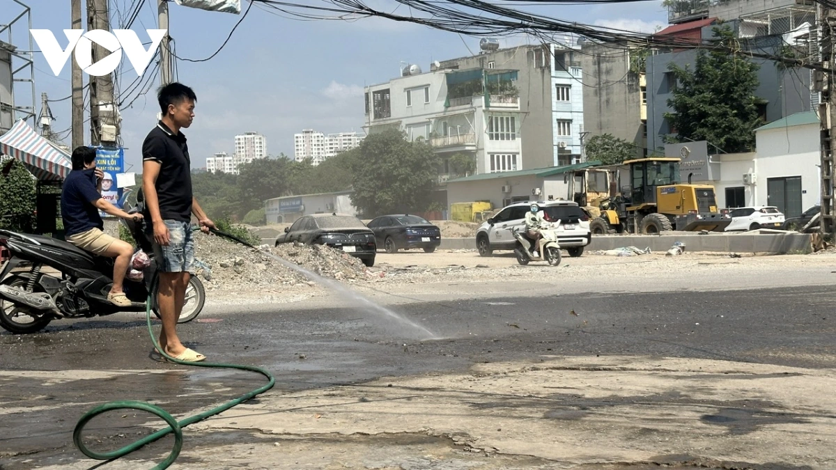 Người dân hàng ngày liên tục xịt nước trước cửa nhà để chống bụi. "Chúng tôii rất mong dự án sớm hoàn thiện nhưng trước hết, chúng tôi cần một không gian trong lành để hít thở, đề nghị đơn vị thi công có biện pháp che chắn hay phun nước hàng ngày để giảm thiểu bụi công trường ảnh hưởng rất nhiều đến sức khỏe và điều kiện sinh hoạt của các gia đình nơi đây", anh Kh. nói.