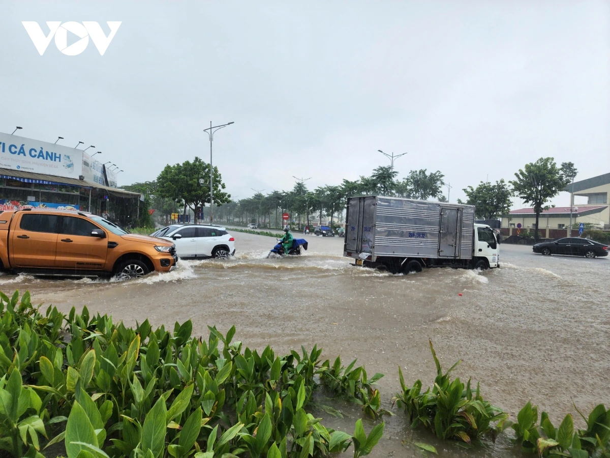Đường Phạm Tu chìm trong biển nước, mưa lớn xối xả che khuất tầm nhìn, khiến người tham gia giao thông chật vật, vất vả nhích từng mét để di chuyển.