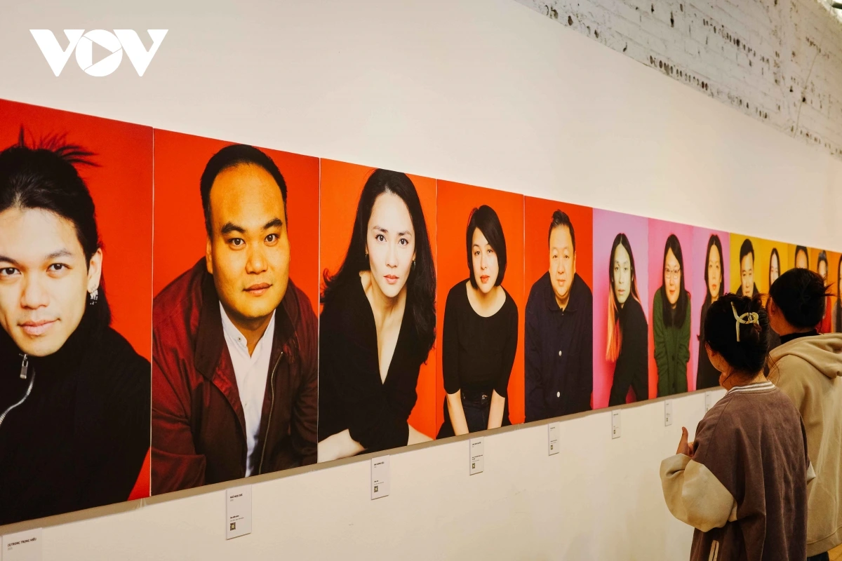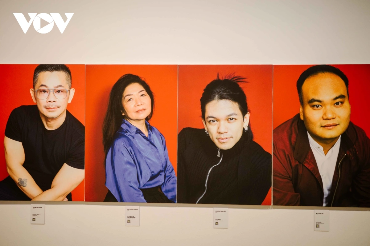 Một góc trưng bày bộ ảnh "20 Gương mặt" với tông màu đen – đỏ – vàng chủ đạo. Sự tối giản trong bố cục làm nổi bật thần thái, giúp mỗi nhân vật tự kể câu chuyện bằng ánh nhìn của chính họ.
