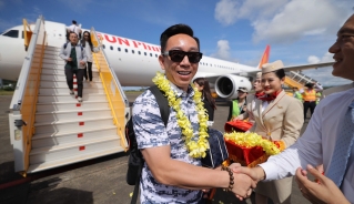 VOV.VN - Không khí rộn ràng bao trùm các đầu sân bay lớn Hà Nội, Đà Nẵng, TP.HCM khi những hành khách đầu tiên của Sun PhuQuoc Airways lên đường đến đảo Ngọc.