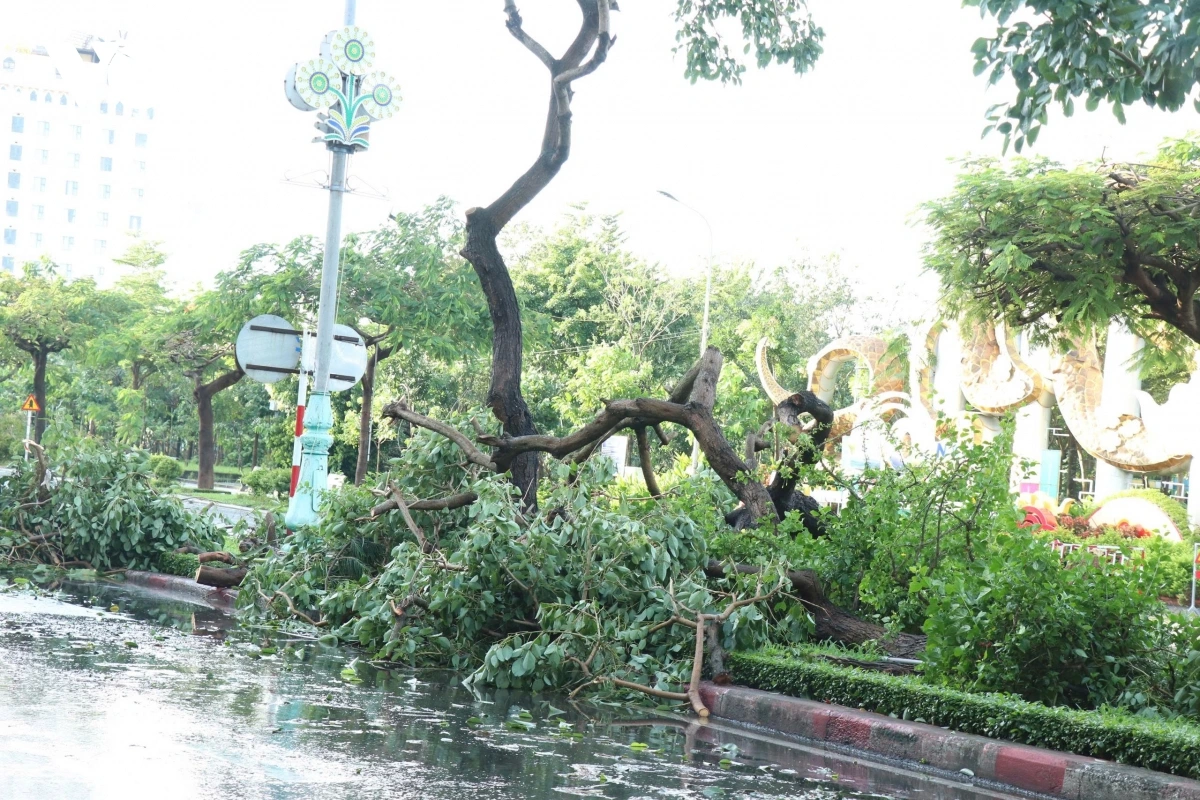 Sức gió giật mạnh kèm mưa lớn khiến nhiều cây cổ thụ trên các tuyến đường trung tâm phường Tuy Hòa (tỉnh Phú Yên cũ) bị bật gốc, chắn ngang lòng đường.
