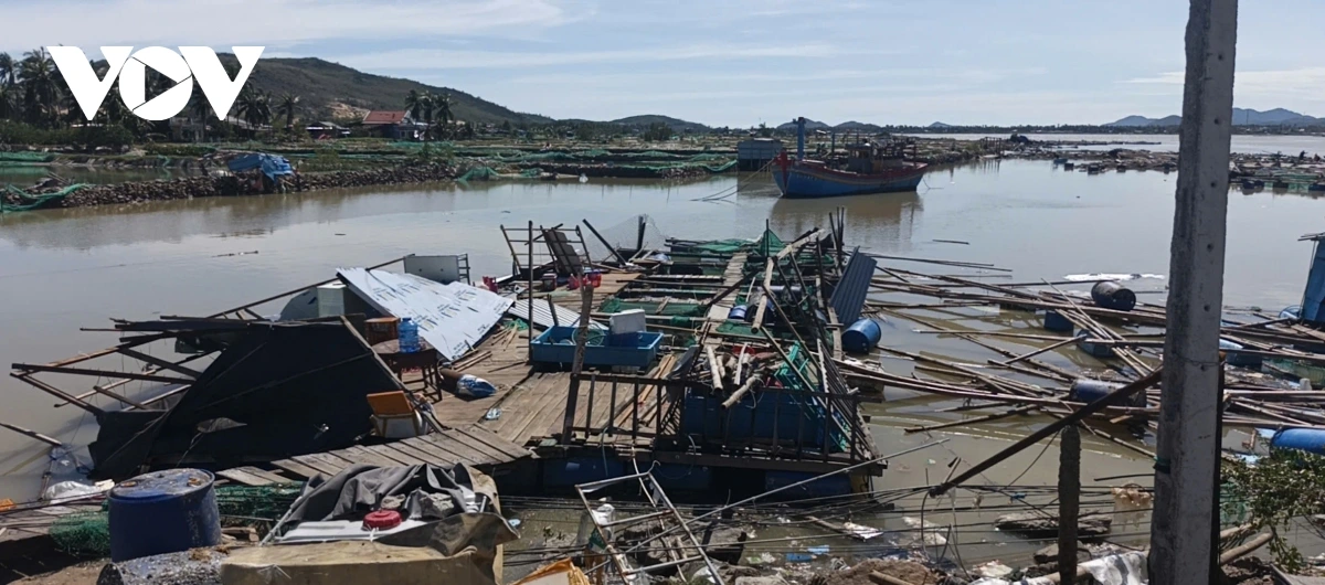 Sóng lớn và gió mạnh đã đánh sập hàng trăm bè nuôi cá. Khu nuôi trồng thủy sản xã Xuân Cảnh tan hoang.