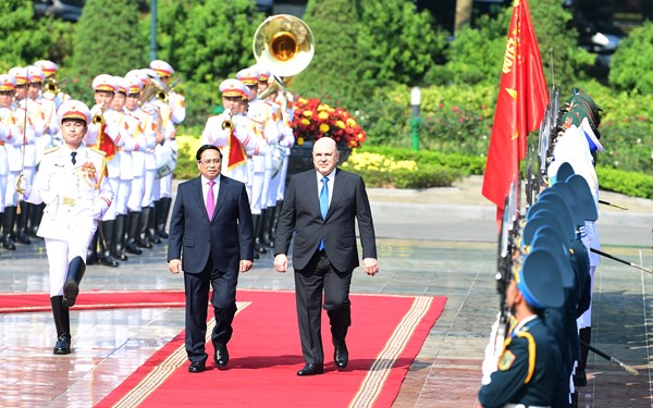 VOVVN - VOV.VN - Chiều 14/1, tại Phủ Chủ tịch, Thủ tướng Chính phủ Phạm Minh Chính chủ trì Lễ đón chính thức Thủ tướng Chính phủ Liên bang Nga Mikhail Vladimirovich Mishustin thăm chính thức Việt...