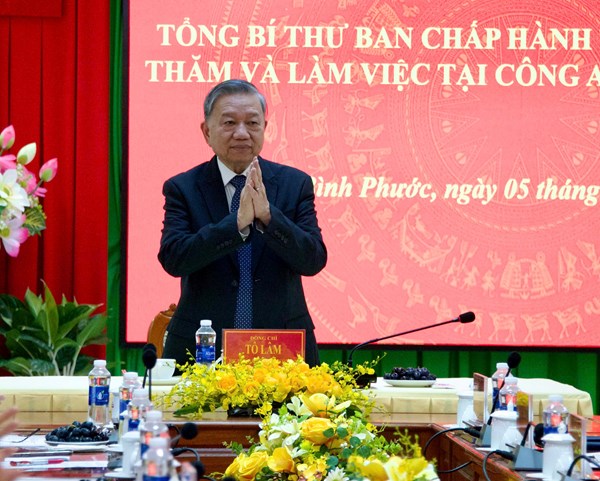 VOVVN - VOV.VN - Chiều nay (5/1), tại Bình Phước, Tổng Bí thư Tô Lâm dẫn đầu đoàn công tác trung ương tới thăm và chủ trì buổi làm việc với công an tỉnh Bình Phước.