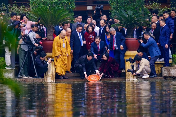 VOVVN - VOV.VN - Ngày 19/1, trong khuôn khổ chương trình Xuân Quê hương 2025, Chủ tịch nước và Phu nhân cùng 100 kiều bào đã tham gia hoạt động phóng sinh cá chép tại khu ao...
