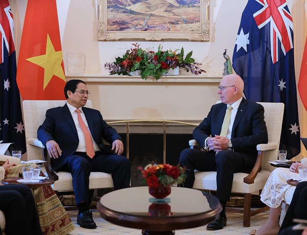 VOVVN - VOV.VN - Sáng ngày 7/3, tại Phủ Toàn quyền, Thủ đô Canberra, Thủ tướng Chính phủ Phạm Minh Chính cùng Phu nhân đã hội kiến Toàn quyền Australia David Hurley và Phu nhân Linda Hurley...