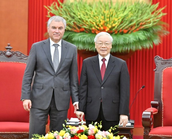 Tổng Bí thư Nguyễn Phú Trọng tiếp Chủ tịch Duma quốc gia Liên bang Nga
