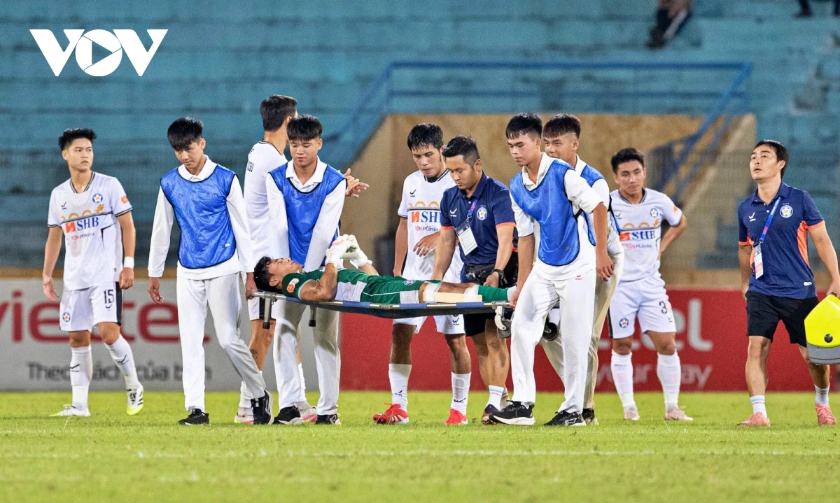Cựu thủ thành của HAGL buộc phải rời sân bằng cáng với phần chân được cố định bằng nẹp. Người vào thay anh là thủ môn Văn Biểu.
