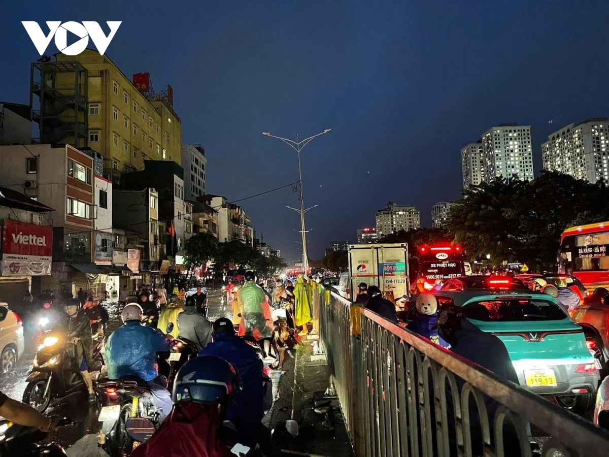 Theo ghi nhận của phóng viên Báo Điện tử Tiếng nói Việt Nam, càng về cuối buổi chiều, mưa càng nặng hạt, trên khắp các tuyến phố ở Hà Nội, dòng người ra về mắc kẹt giữa những con đường ngập trắng. Không ít nhân viên văn phòng chỉ biết ngồi bất lực tại công ty, vừa chờ mưa ngớt vừa lo lắng không biết đến bao giờ mới có thể về nhà.