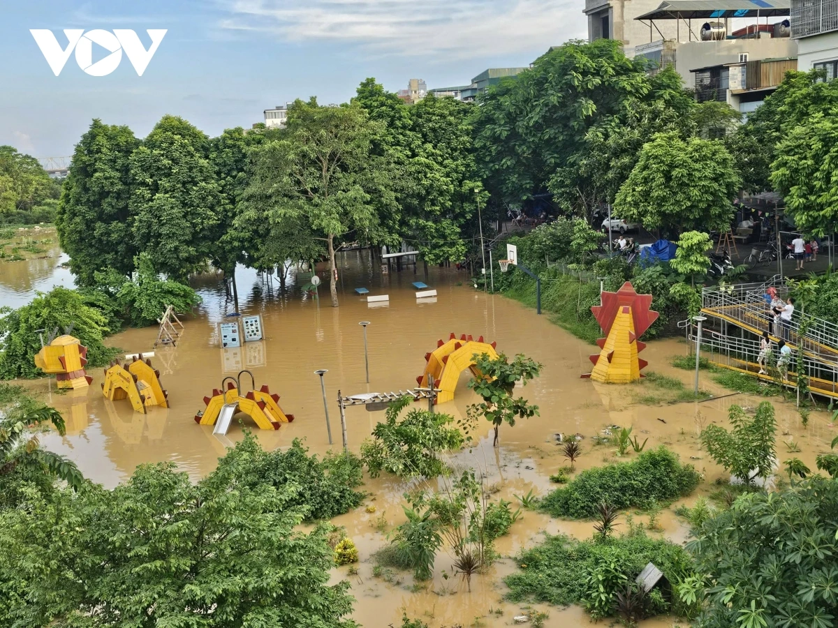 Ngày 2/10, nước lũ sông Hồng lên nhanh, chảy xiết, gây ngập khu dân cư dưới chân cầu Long Biên, dù hôm nay ở Hà Nội đã hết mưa, trời nắng ráo. Trong ảnh là sân chơi (thuộc phường Phúc Tân cũ) dưới chân cầu Long Biên ngập sâu dưới nước.
