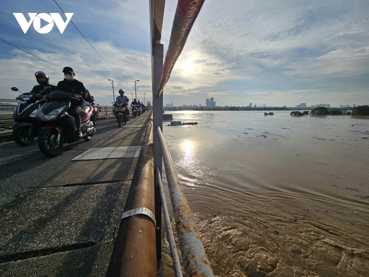 Sông Hồng đoạn chảy qua cầu Long Biên, sáng 2/10 đỏ ngầu cuồn cuộn phù sa. Nước lũ dâng cao, bao quanh như muốn nuốt trọn cây cầu Long Biên. Dòng lũ từ thượng nguồn đổ về không chỉ nhấn chìm nhà cửa, vườn tược mà còn kéo theo những khối gỗ, cành cây và rác thải trôi dạt khắp mặt sông - tạo thành mối nguy tắc nghẽn, ô nhiễm và làm ảnh hưởng tới đời sống sinh hoạt, sản xuất của các khu dân cư ven sông.