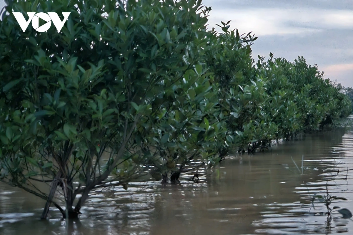 Giữa dòng nước lũ, những luống đào chỉ còn trơ ngọn lá xanh lấp ló trên mặt nước. Cả vườn cây vốn thẳng hàng, xanh mướt giờ biến thành ao hồ, cho thấy sức tàn phá khốc liệt của trận ngập lụt bất thường.