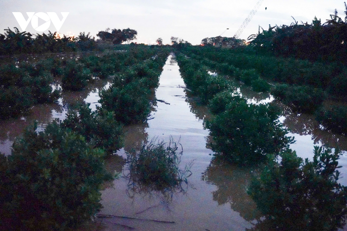 Nước sông Hồng dâng cao do bão số 10 khiến nhiều diện tích trồng cây cảnh của làng đào Phú Thượng-Nhật Tân và làng quất Tứ Liên, một số vùng ven sông người dân trồng cây ăn trái bị ngập nặng.