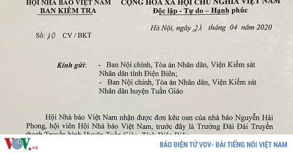 VOVVN - VOV.VN -Hội Nhà báo Việt Nam vừa có công văn gửi cơ quan tố tụng tỉnh Điện Biên đề nghị điều tra công tâm, làm rõ vụ án liên quan nhà báo Nguyễn Hải Phong.