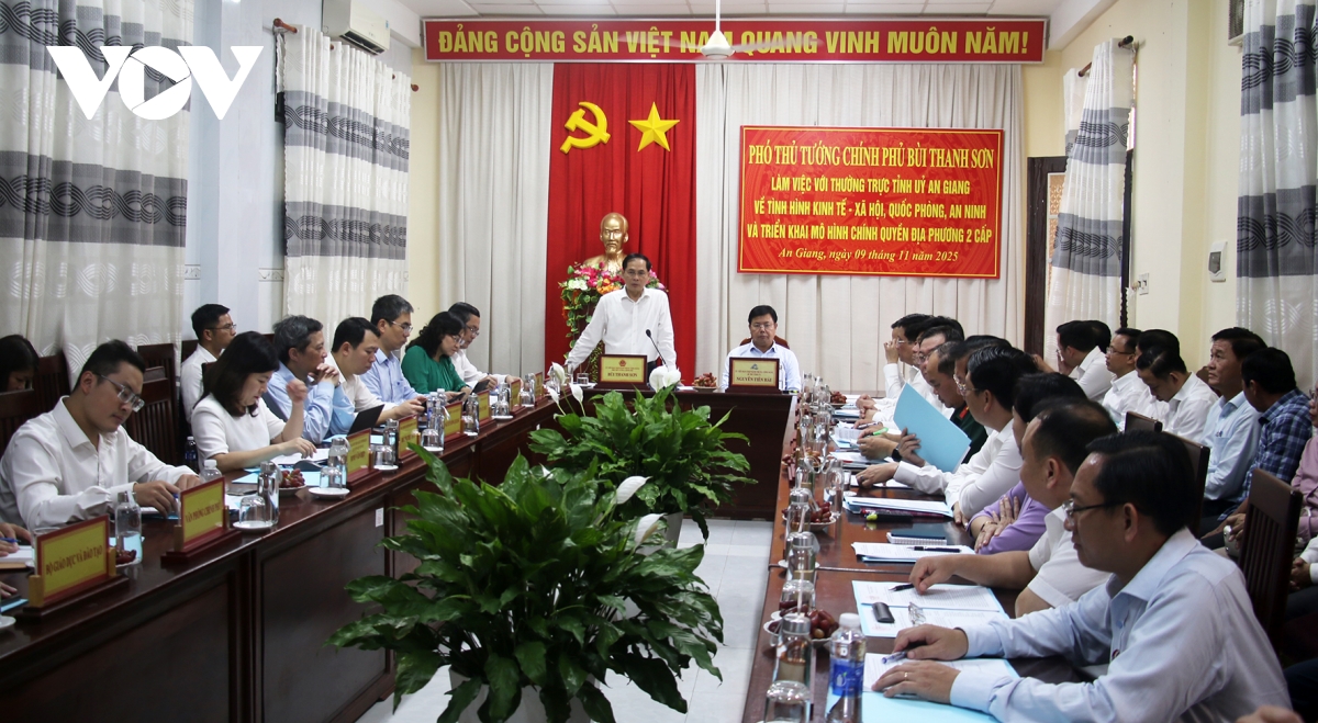 VOV.VN - Chiều 9/11, trong chuyến công tác tại An Giang dự và chỉ đạo lễ khởi công xây dựng trường nội trú liên cấp tại các xã biên giới, Phó Thủ tướng Chính phủ Bùi Thanh Sơn cùng đoàn công tác đã làm việc với Thường trực Tỉnh ủy An Giang về tình hình kinh tế - xã hội, giải ngân đầu tư công, chính quyền 2 cấp...