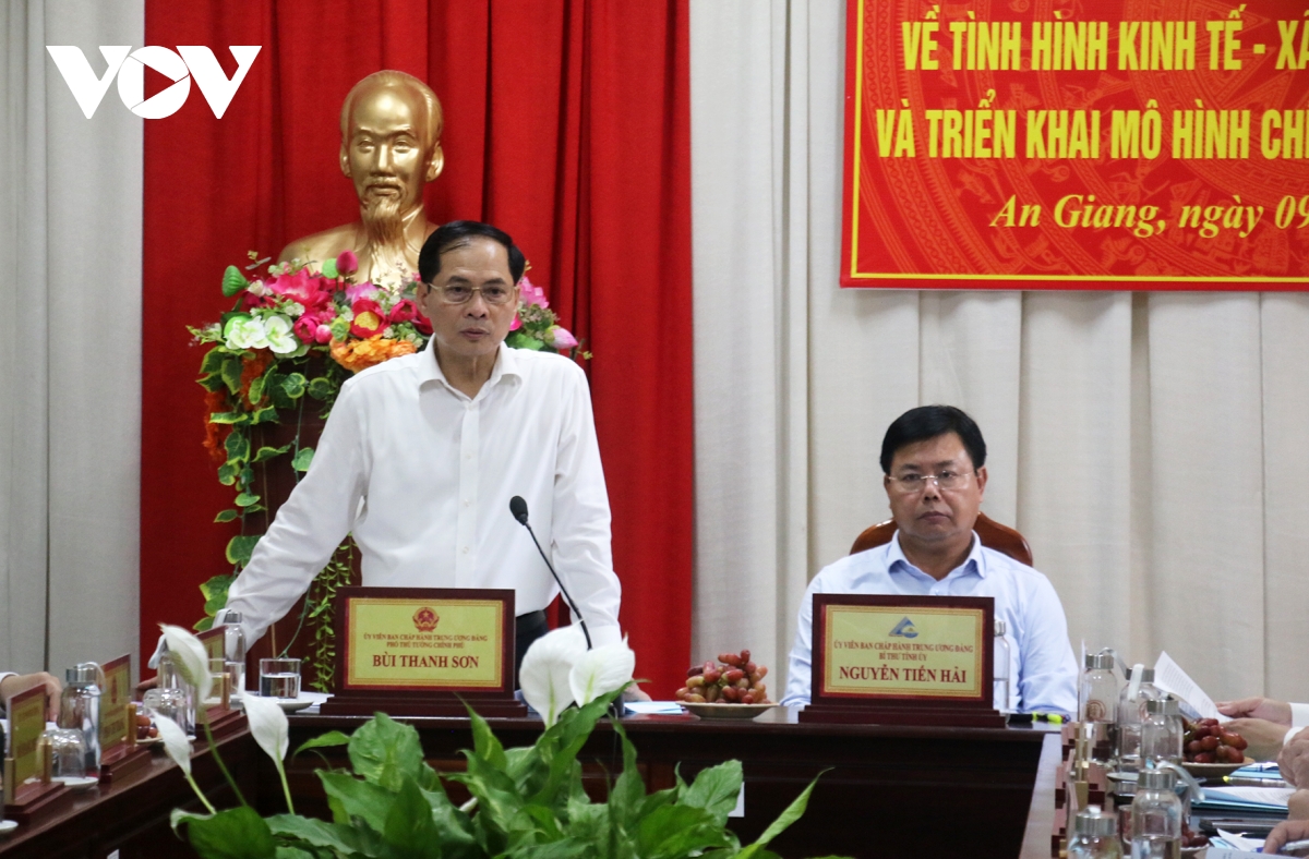 Phó Thủ tướng Chính phủ Bùi Thanh Sơn nhấn mạnh: "Tiếp tục vận hành chính quyền địa phương 2 cấp đảm bảo thông suốt, hiêu quả, không gián đoạn, không ảnh hưởng các hoạt động của các cơ quan, người dân và doanh nghiệp; khẩn trương nghiên cứu và chuẩn bị thực hiện quy trình thủ tục về điều chỉnh quy hoạch của tỉnh An Giang mới ngay sau khi luật quy hoạch được quốc hội thông qua, theo như Tổng bí thư đã nêu đưa An Giang trở thành trung tâm phát triển năng động toàn diện bền vững của ĐBSCL và giữ vai trò kết nối chiến lược đông và tây, biển với biên giới, đô thị với nông thôn, dịch vụ sản xuất du lịch, đặc biệt hướng tới mục tiêu trở thành trung tâm kinh tế biển quốc gia, góp phần tái định vị vai trò của An Giang trong cấu trúc kinh tế quốc gia".