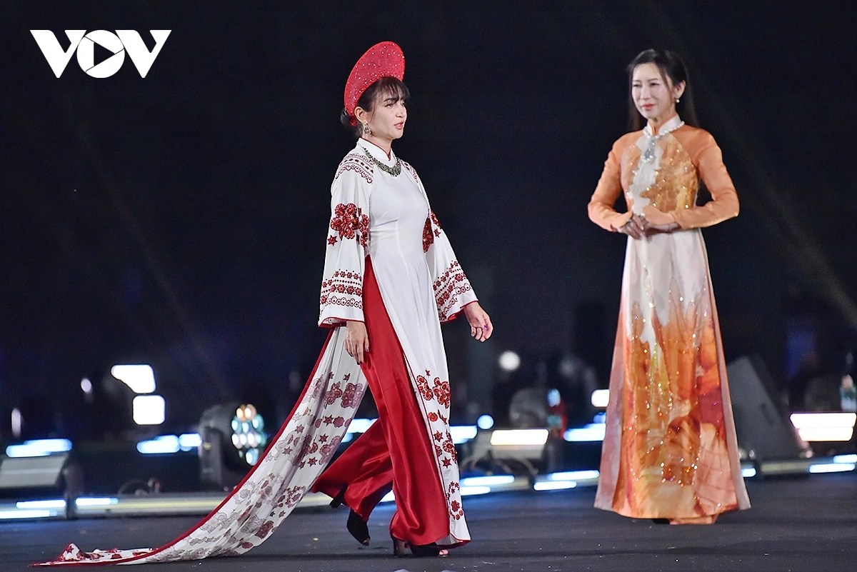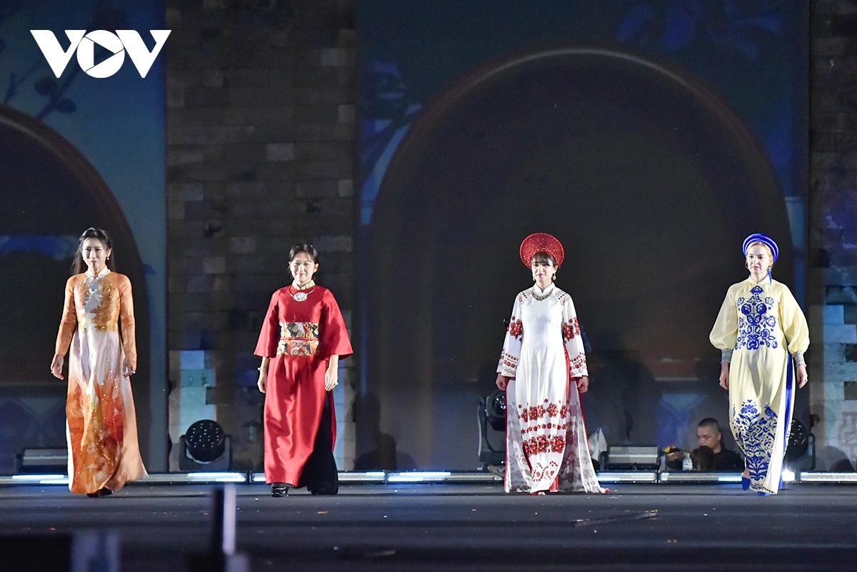 VOV.VN - 4 phu nhân đại sứ Séc, Nhật Bản, Ukraine và Mỹ đã trình diễn bộ sưu tập áo dài của NTK Anh Thư (thương hiệu Áo dài Ngân An) trong chương trình trình diễn trang phục dân tộc quốc tế “Bước chân di sản” diễn ra tối 11/10 tại Hoàng Thành Thăng Long.