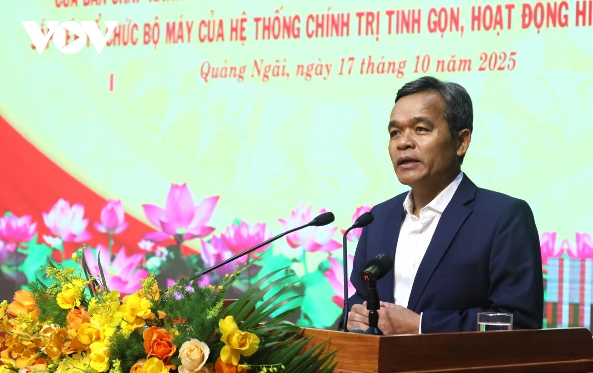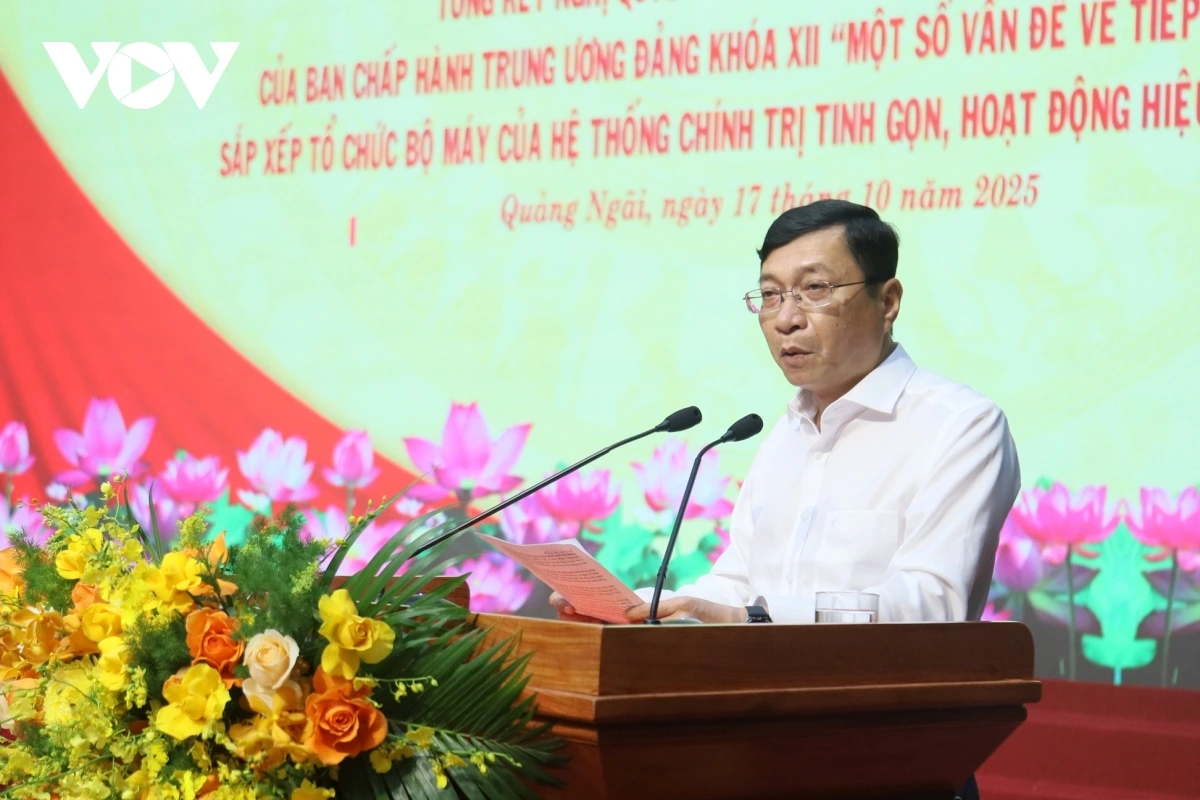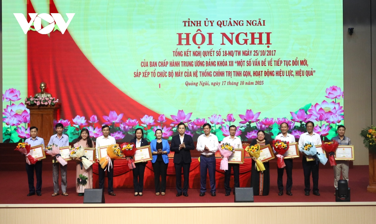 VOV.VN - Chiều nay (17/10), Tỉnh ủy Quảng Ngãi tổ chức Hội nghị tổng kết Nghị quyết số 18-NQ/TW ngày 25/10/2027 của Ban Chấp hành Trung ương Đảng khóa XII về tiếp tục đổi mới, sắp xếp tổ chức bộ máy của hệ thống chính trị tinh gọn, hoạt động hiệu lực, hiệu quả.