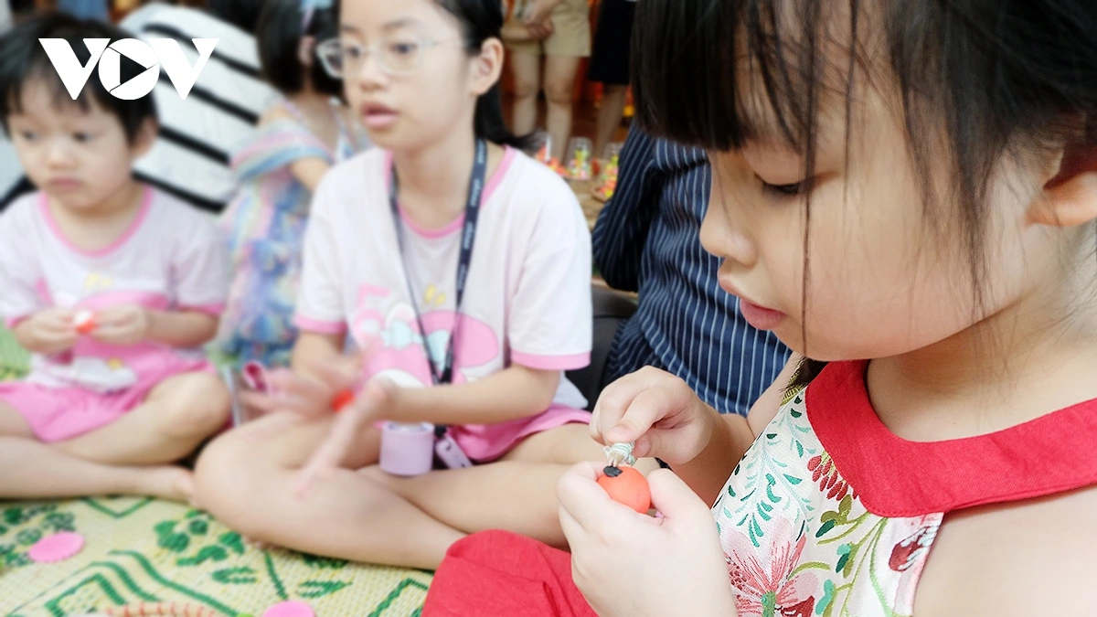 Các em nhỏ không chỉ được ngắm nhìn mà còn có cơ hội học cách làm đồ chơi dưới sự hướng dẫn trực tiếp của các nghệ nhân dân gian.