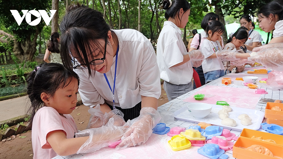 Tình nguyện viên hướng dẫn các em nhỏ làm bánh nướng, bánh dẻo.