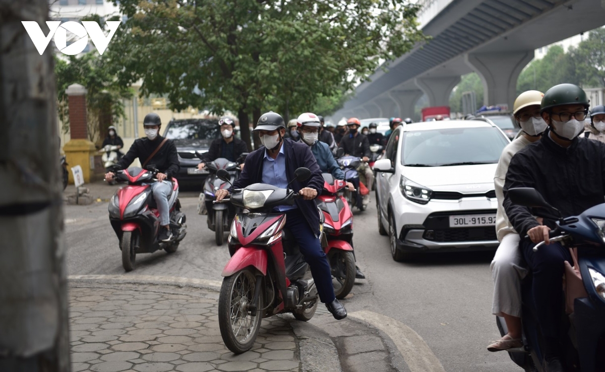 VOV.VN - Buổi sáng đầu tiên đi làm sau kỳ nghỉ lễ 10/3 (Giỗ Tổ Hùng Vương), đường phố Hà Nội tắc như nêm, nhiều người điều khiển xe máy đã "phi" lên vỉa hè để tìm cách thoát khỏi điểm ùn ứ.