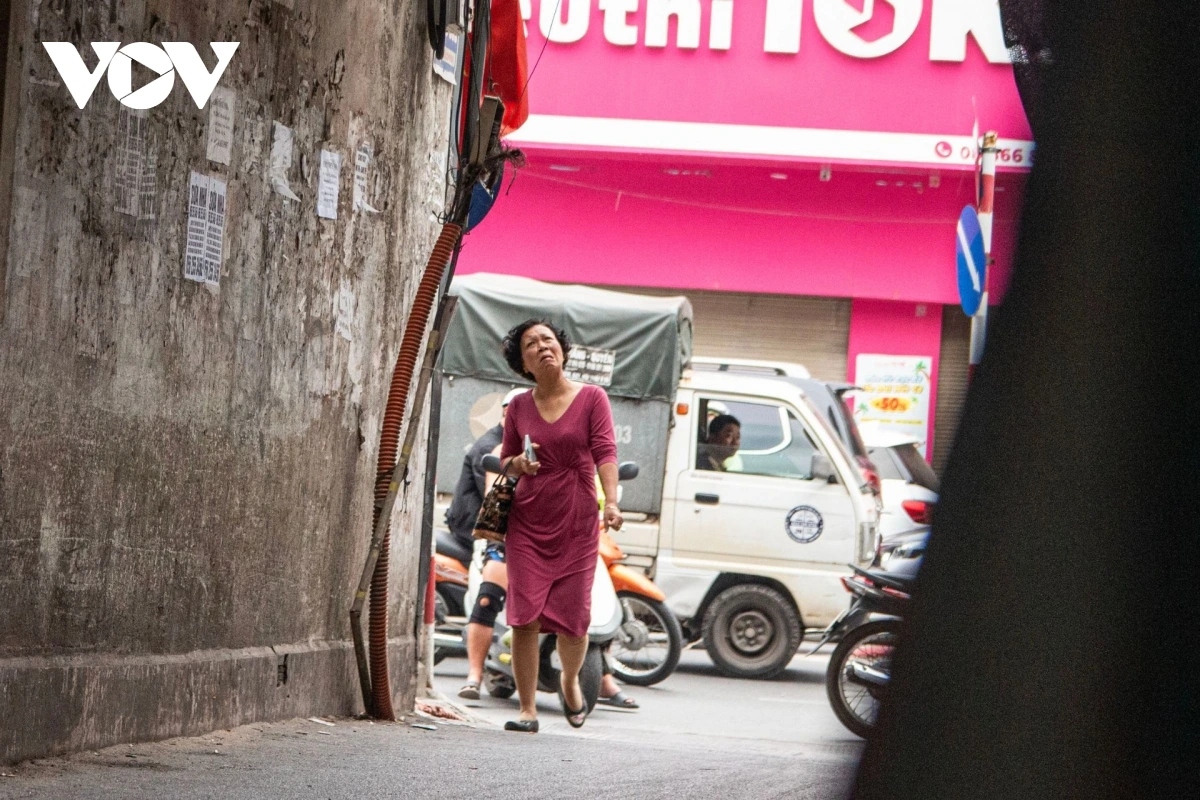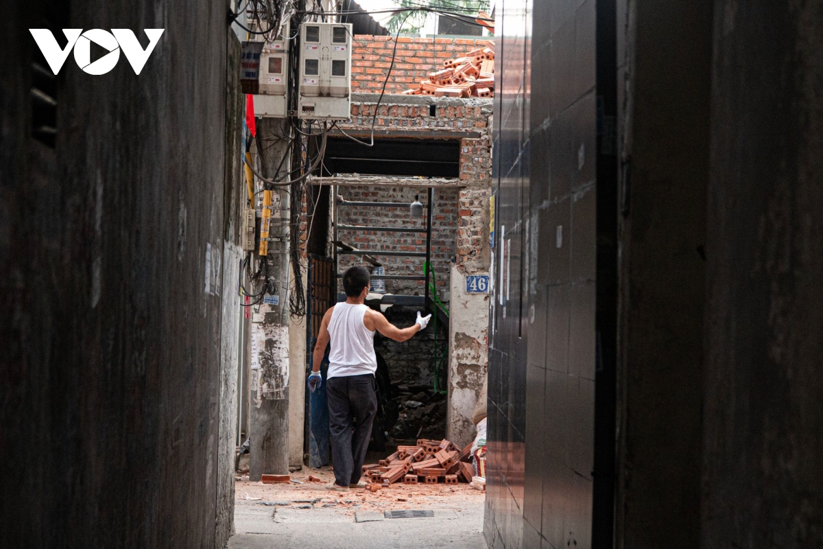 Để tránh khu vực công trình, người đi bộ đành “né” sang lối ngược chiều, men theo bức tường cũ kỹ trong con ngõ nhỏ vắng xe qua lại.