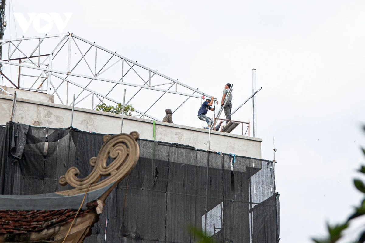 Thậm chí, tại một công trình trong ngõ 144 Quan Nhân, dù đã có lưới chắn bụi nhưng giàn giáo vẫn được dựng sát mép đường. Phía trên, công nhân vẫn đang thi công, tiềm ẩn nguy cơ mất an toàn cho người qua lại bên dưới.