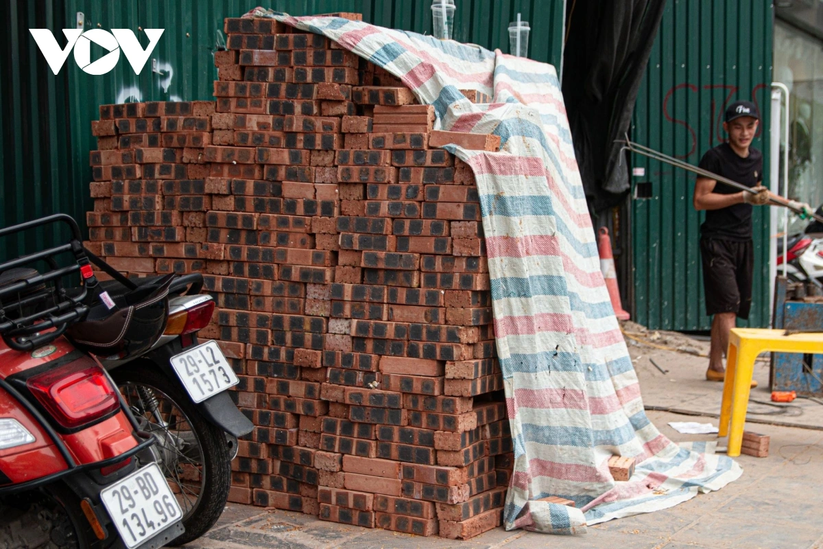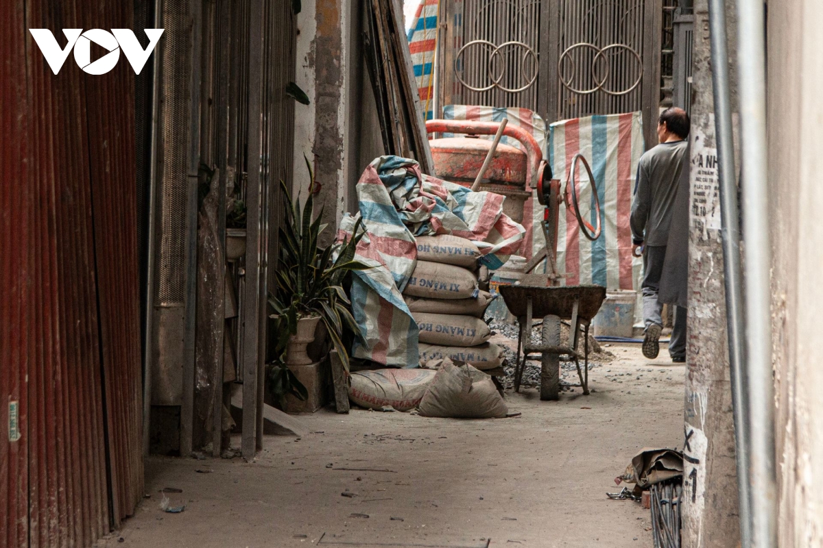 Tương tự, tại một công trình đang xây dựng trên phố Chính Kinh, gạch đá, xi măng chất đống, tràn ra đường trên con ngõ nhỏ.