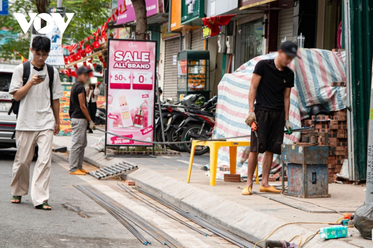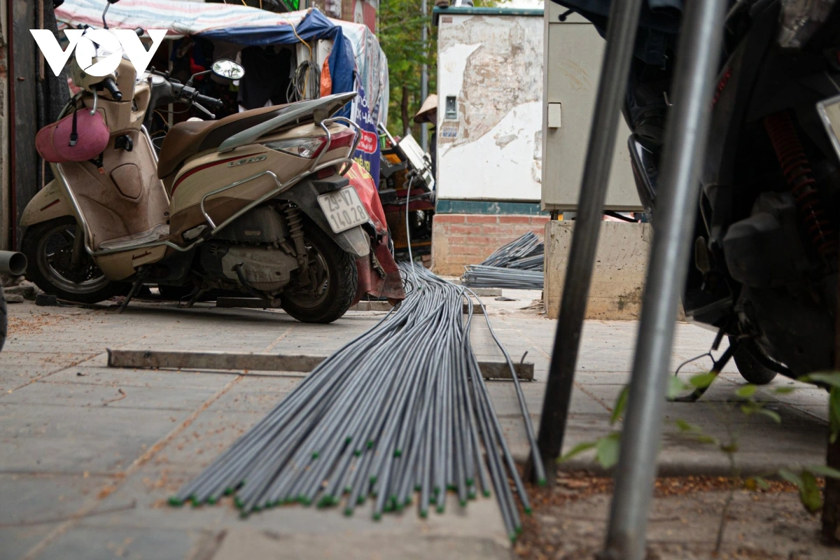 Những thanh sắt nằm ngổn ngang dưới lòng đường. Phần vỉa hè bị trưng dụng để đặt máy móc, thiết bị phục vụ thi công, trong khi người đi bộ buộc phải xuống lòng đường để di chuyển giữa dòng xe cộ qua lại.