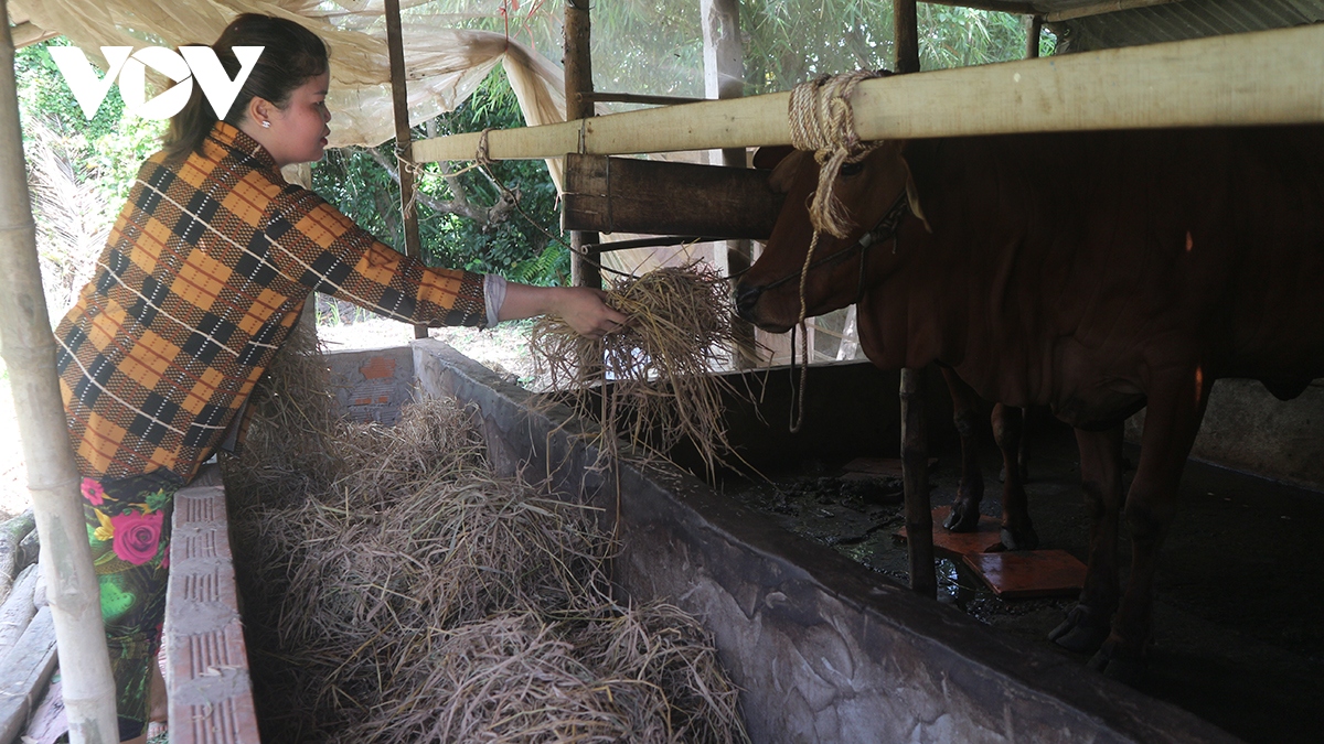 Chị Danh Thị Sóc Kha ở ấp Sóc Xoài, không có tư liệu sản xuất nên đời sống lâu nay luôn chật vật từ năm này qua năm khác. Khi được nhà nước, địa phương xét hỗ trợ được ngôi nhà cùng 1 cặp bò sinh sản từ chương trình mục tiêu quốc gia, chị rất phấn khởi vì có sinh kế cải thiện đời sống. Hiện bò của chị đã mang thai được vài tháng. Mới đây, gia đình cũng được hỗ trợ thêm dụng cụ chứa nước sinh hoạt… Chị Sóc Kha bộc bạch: "Được nhà nước hỗ trợ cất nhà cho rồi 2 vợ chồng mừng lắm, không còn lo lắng như trước đây nữa. Mấy năm trước, mùa mưa như vậy là dột khắp nơi, rất là vất vả, bây giờ không còn lo nữa".