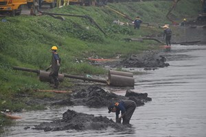 Công nhân bì bõm lội bùn nạo vét sông, hồ chống ngập úng nội đô Hà Nội