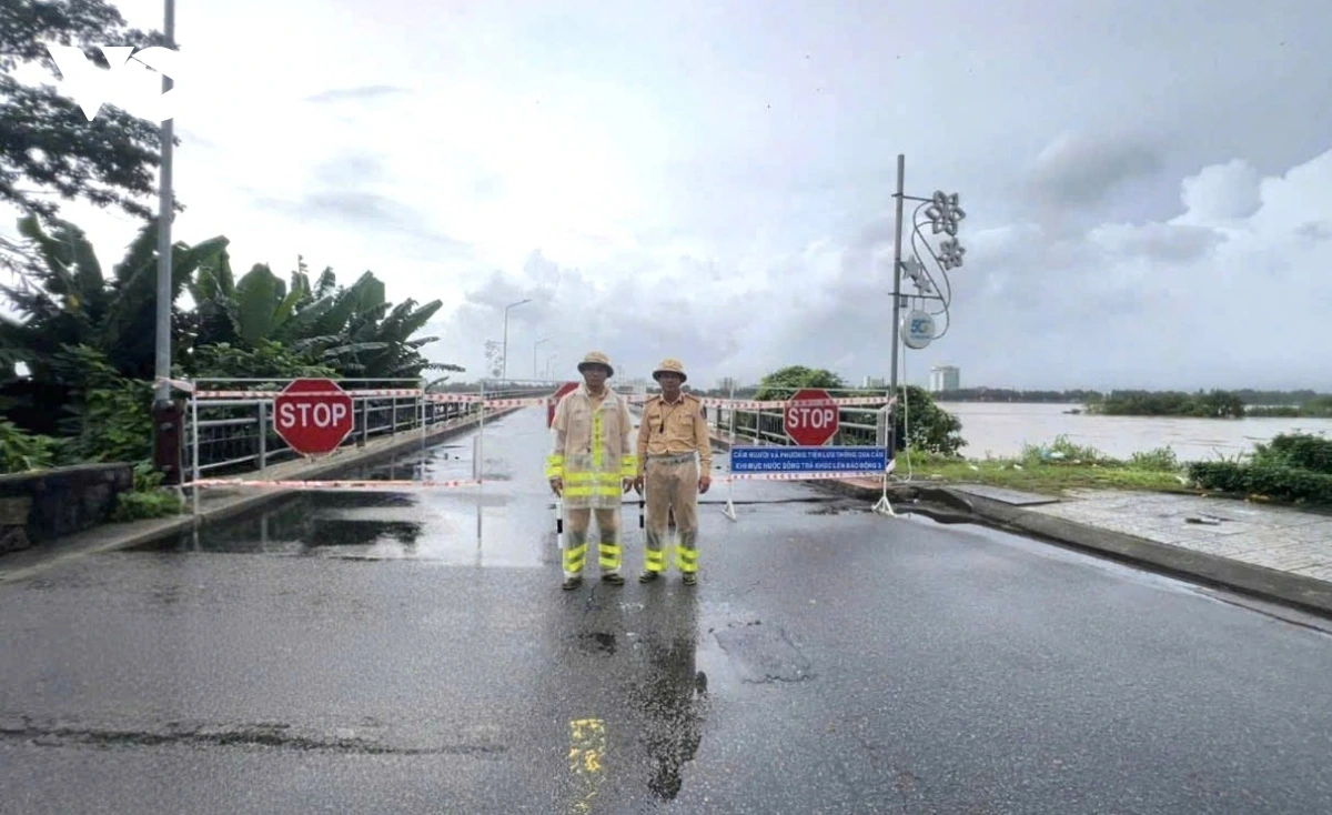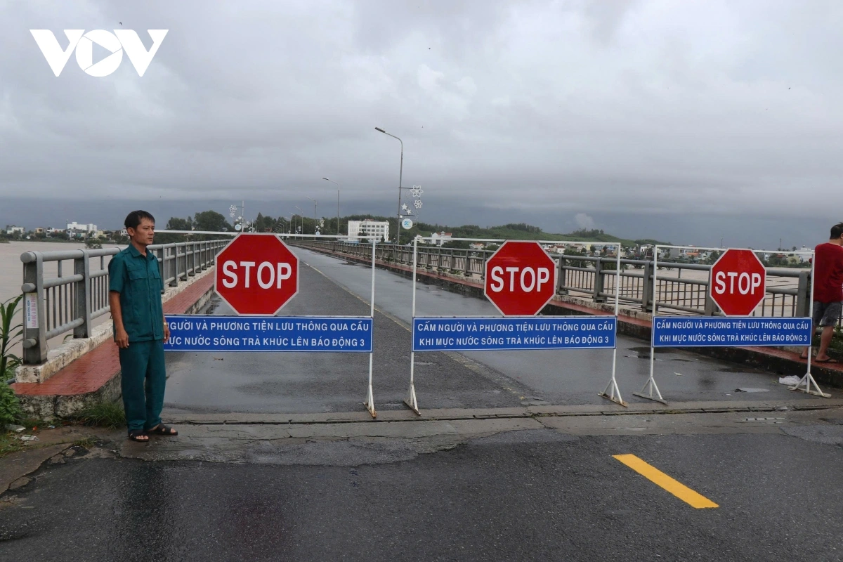 VOV.VN - Sáng ngày 29/10, do mưa lớn kéo dài, mực nước trên các sông ở tỉnh Quảng Ngãi lên nhanh, nhiều nơi đã vượt mức báo động 3. Trước tình hình này, tỉnh Quảng Ngãi tạm thời cấm phương tiện lưu thông qua cầu Trà Khúc 1 để đảm bảo an toàn.