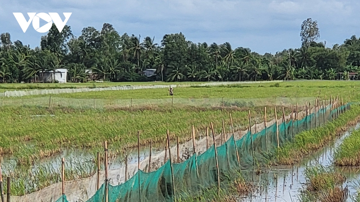 VOV.VN - Sau khi thu hoạch lúa Hè thu xong, hiện nông dân không thể canh tác vụ lúa Thu Đông tại nhiều cánh đồng thuộc vùng trũng của tỉnh Hậu Giang, nên đang tất bật rào lưới cước bao quanh ruộng của gia đình mình để tiến hành thả cá vào nuôi.