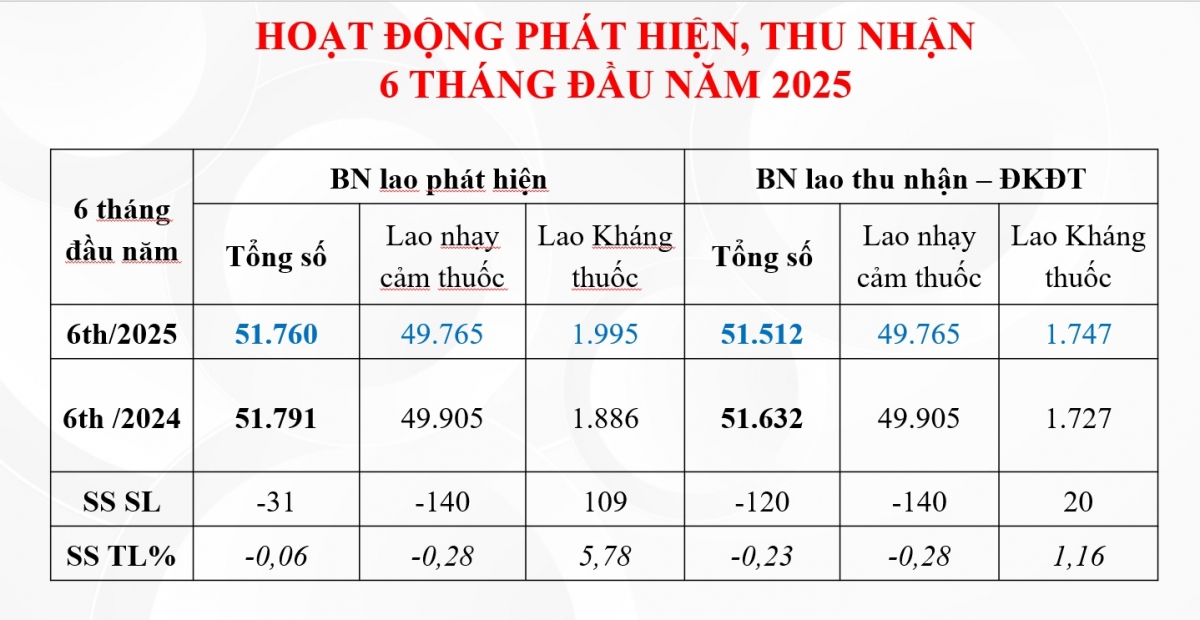 Đáng chú ý, trong 6 tháng đầu năm, Chương trình Chống lao Quốc gia tiếp tục triển khai nhiều hoạt động trọng điểm, đặc biệt trong khu vực trại giam, tạm giam và các nhóm nguy cơ cao. Đến nay, 19.417 người bệnh lao tiềm ẩn đã được phát hiện, thu dung và điều trị tại 54 trại giam trên toàn quốc.